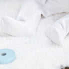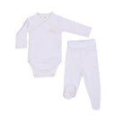 An ivory and white five-piece set for girls, made in comfortable cotton jersey. The set includes 2 bodysuits with the brand's logo embroidered on the side and under a foot. The matching 2 leggings with feet have elasticated waist for comfort. The soft cardigan is lightly padded and lined with soft white jersey with an embroidery on the side.