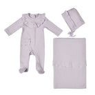 The "Emilia" gift box is the ultimate collection of soft essentials for your baby, featuring a lilac ribbed jersey footie, hat, blanket, and handmade pacifier clip. Expertly designed for your little princess with charming ruffle details and crafted for comfort, this set is a must-have for any new parent.