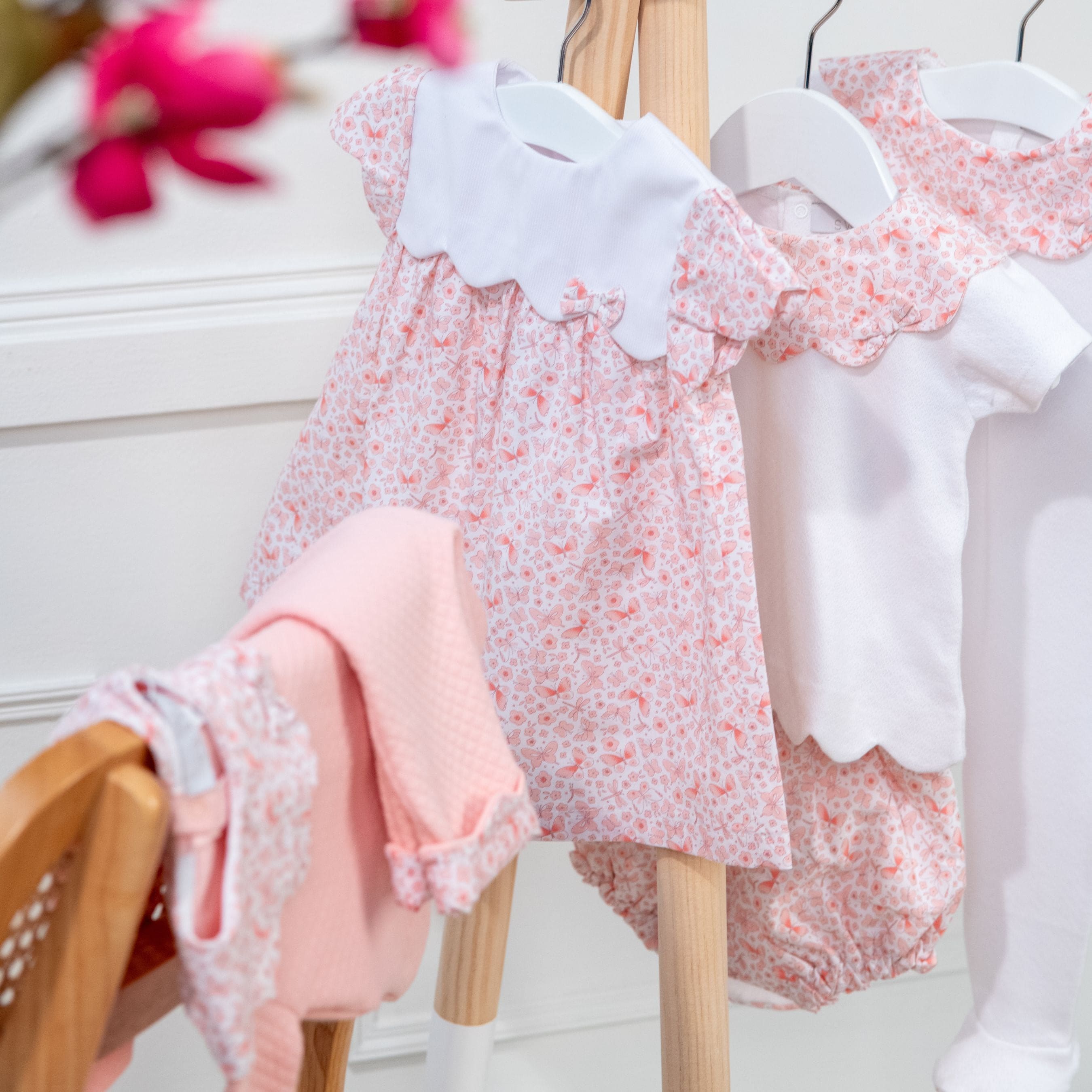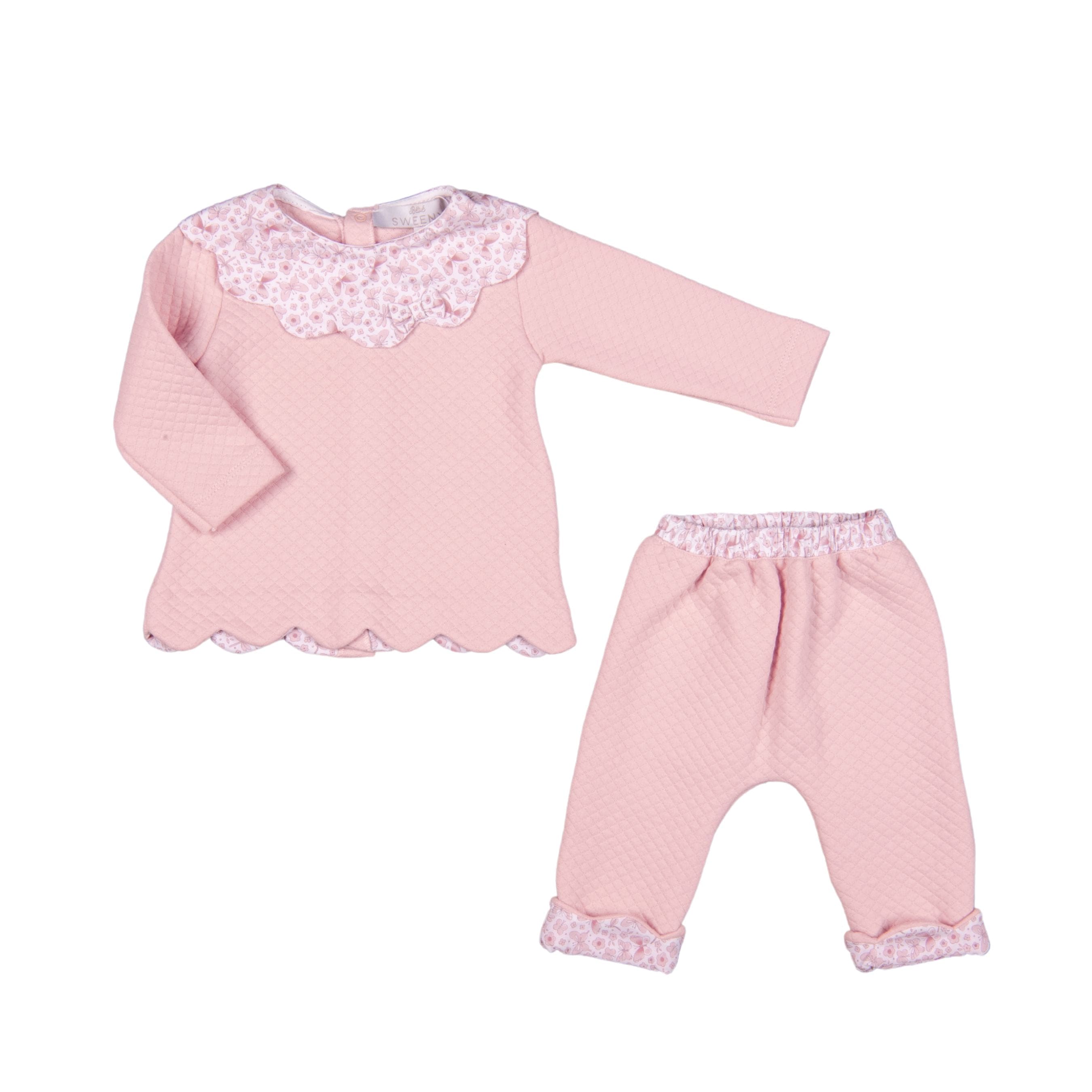This pink set for baby girls is made from soft quilted cotton and features a charming poplin collar with scalloped details along the top and bottom. On the bottom of the pants, there is a lovely butterfly print that can be turned up, and the waistband is elasticated for added comfort.