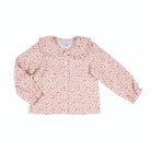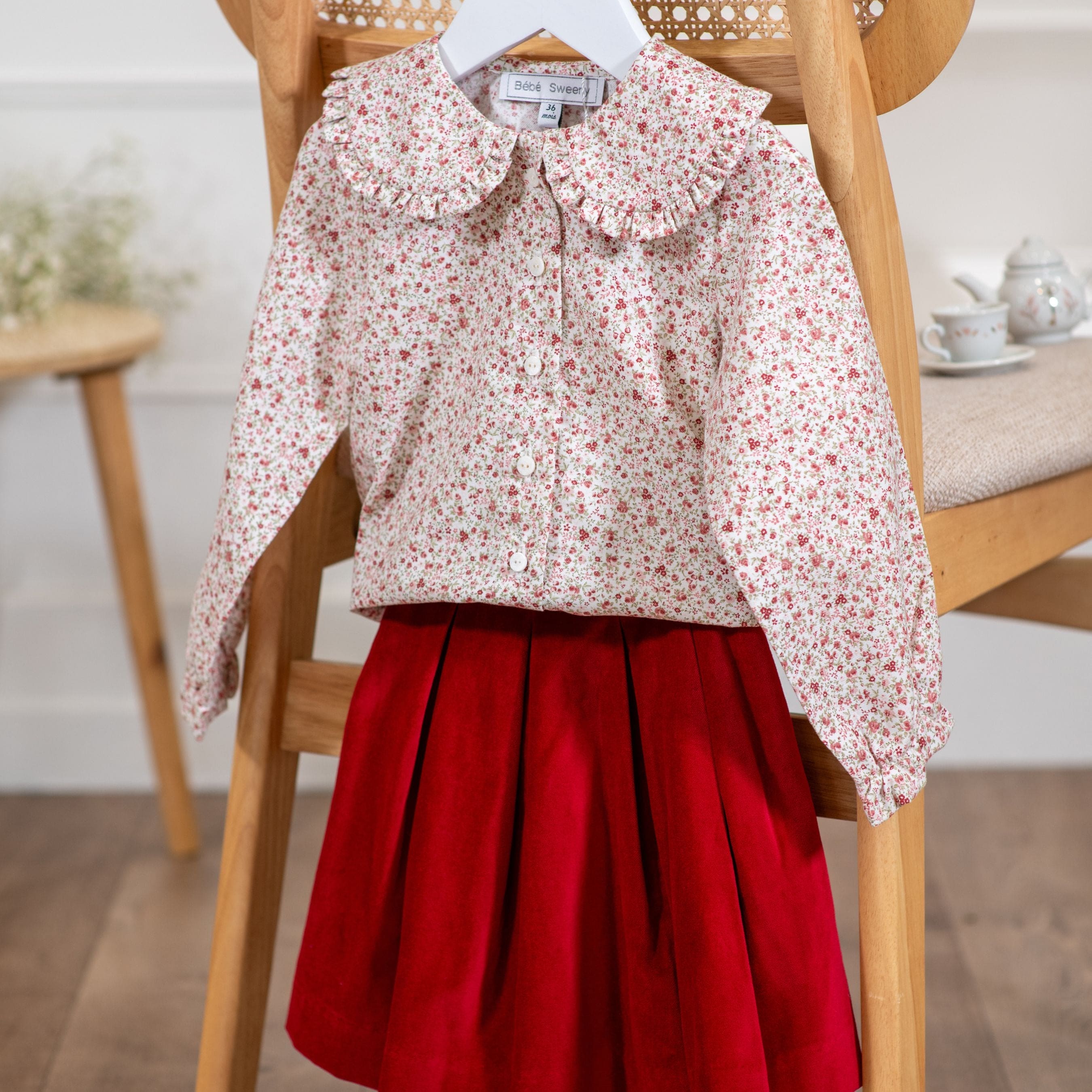 Girls pretty floral blouse, in white with a red floral pattern. Made in soft and lightweight cotton, this charming collared blouse features ruffle trims and pearly button fastenings on the front. Elasticated at the cuffs, it is both stylish and comfortable. Match this blouse with our Flore skirt to craft a graceful, coordinated look with effortless sophistication.