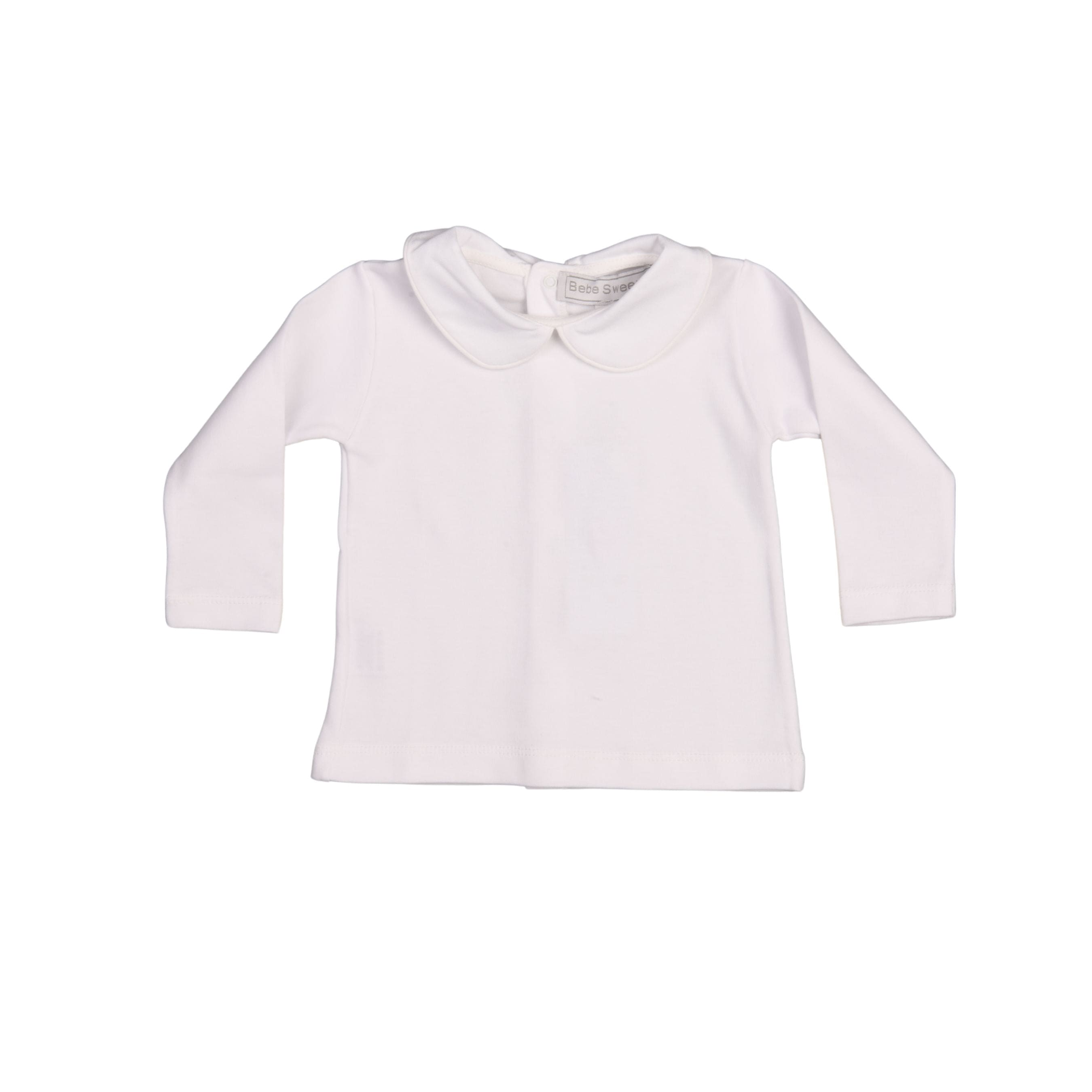 This white t-shirt is designed for both baby boys and girls, combining practicality with comfort. Made from soft cotton jersey, it features a charming poplin cotton Peter Pan collar. The design includes classic rounded collar details and secure popper fastenings at the back for easy dressing and changing.