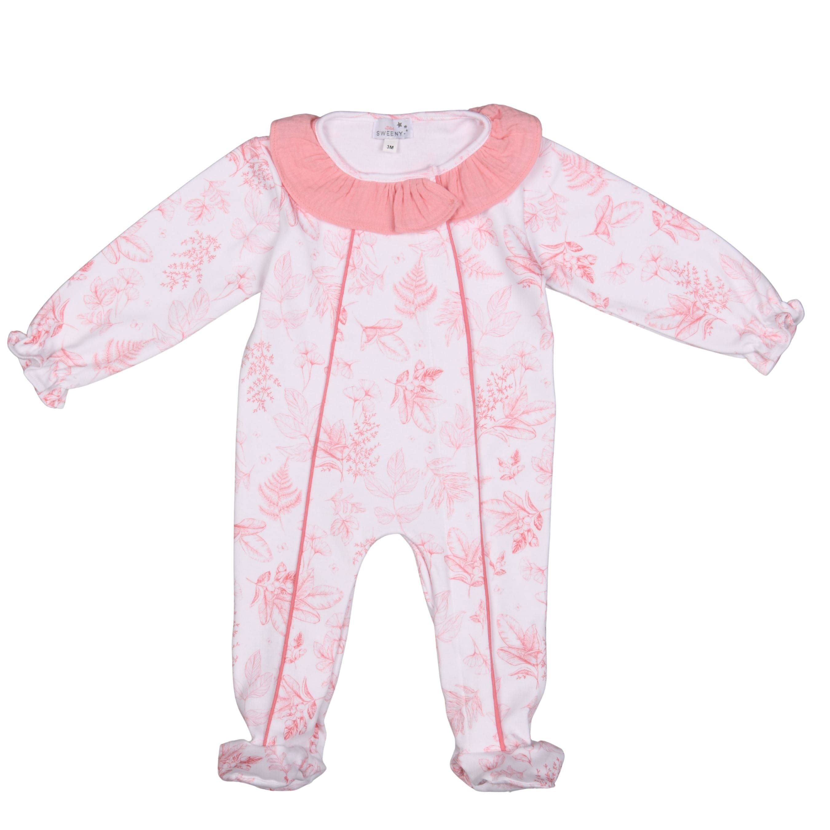 An elegant all-in-one crafted in soft cotton interlock, featuring our exclusive pink Toile de Jouy print and a refined pink double-gauze Peter Pan collar. Delicate piping details and a timeless silhouette make it a signature Bebe Sweeny piece for baby girls.