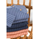 Baby boys gorgeous dusty blue trousers set in ribbed knit. Super soft and comfortable, the sweater fastens on the side with natural beige wooden buttons. The matching trousers are full length and have an elasticated waistband. Complete the set with the matching hat and blanket available in the same collection.