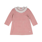 Pink dress for younger girlsi, made in soft velvet. This charming style has a pretty, oversized white collar, with delicate hand-smocked embroideries. It has long sleeves and fastens neatly with mother-of-pearl buttons on the back.