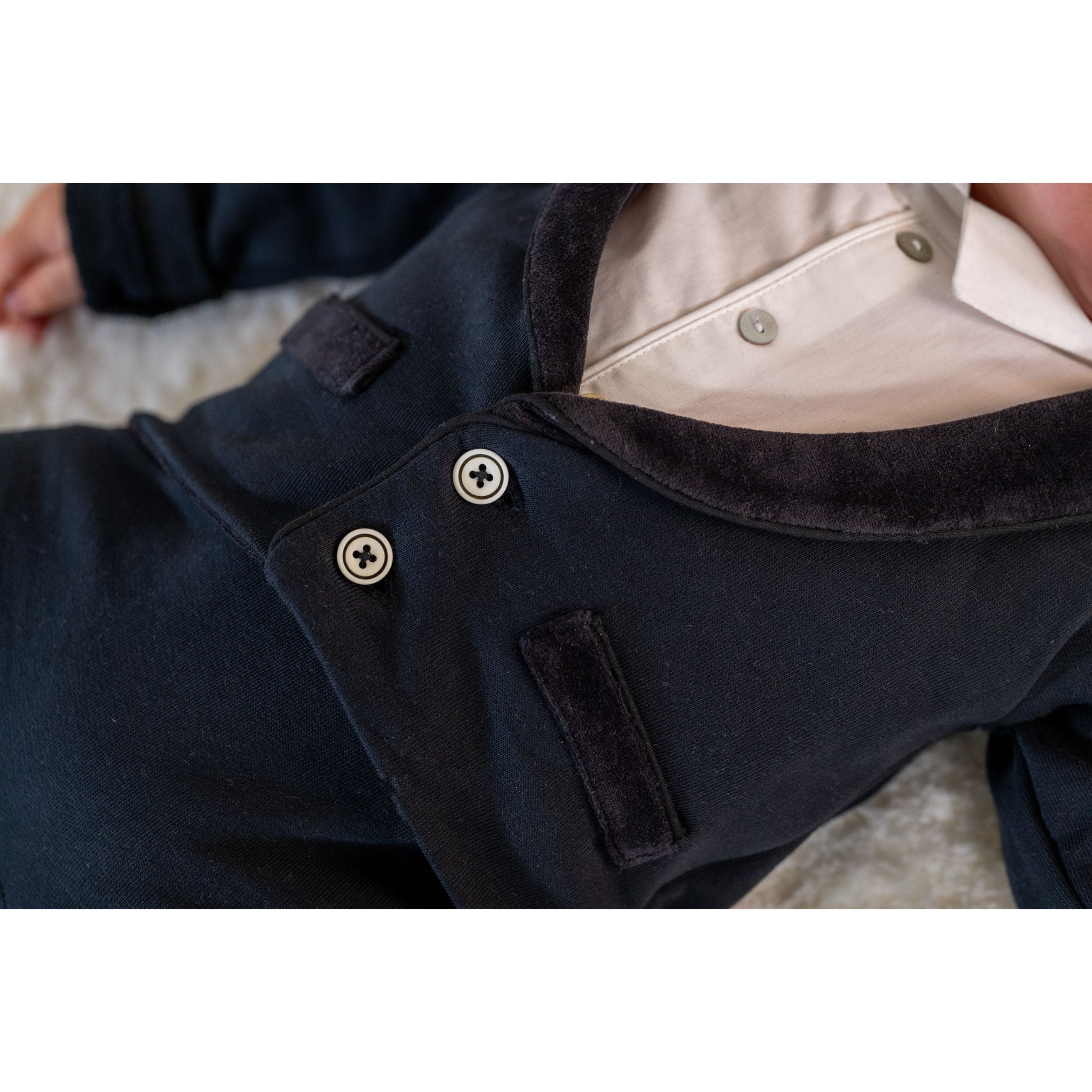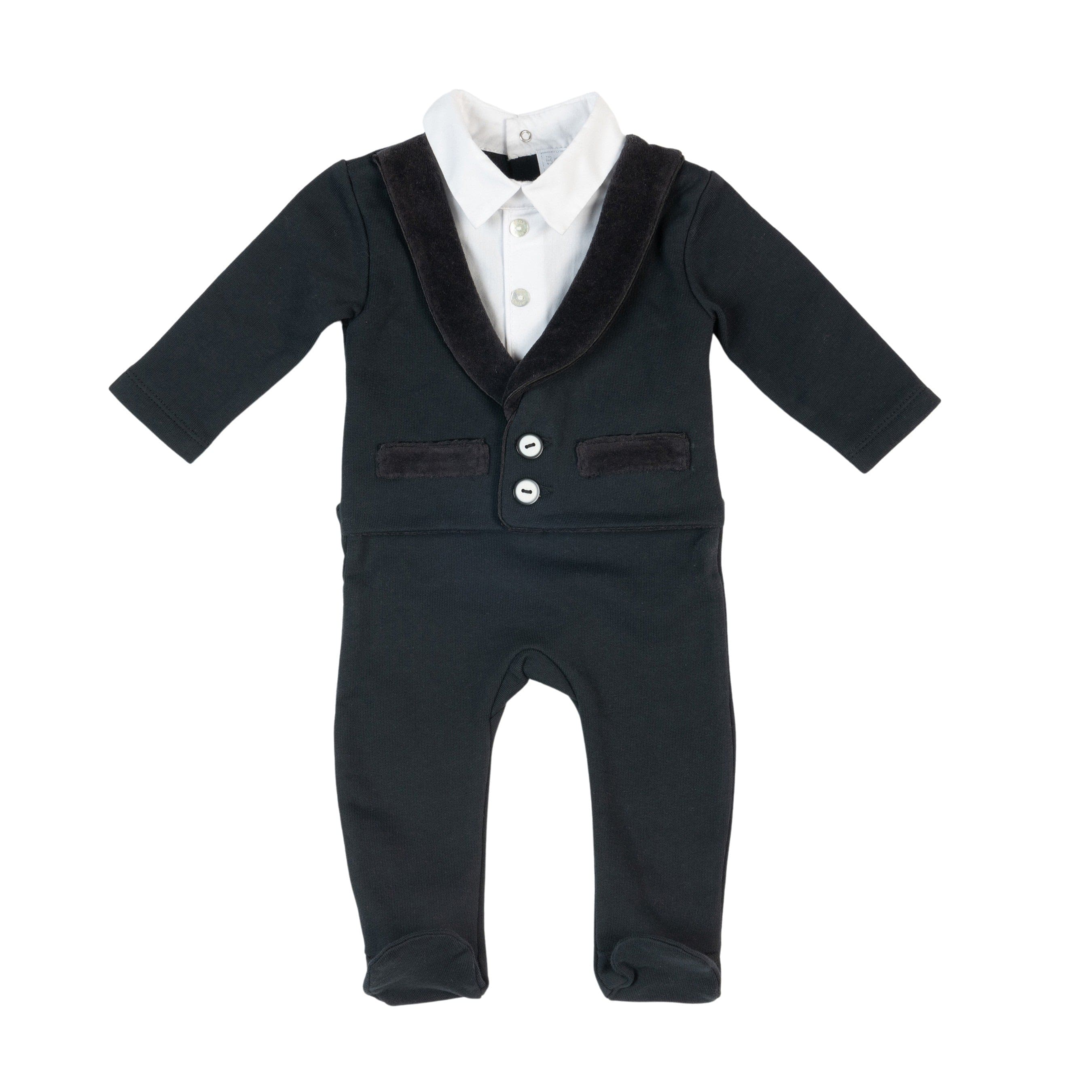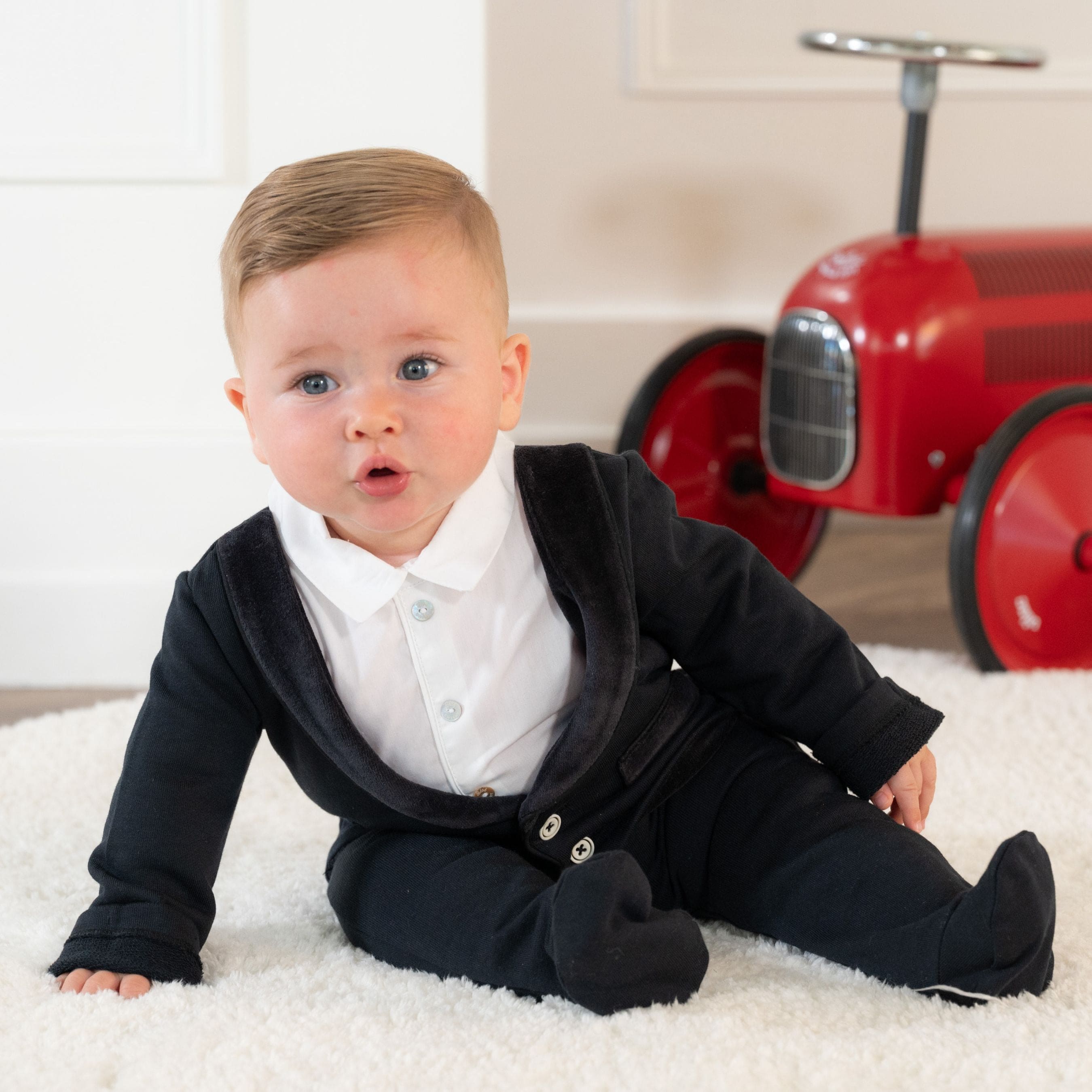 A charming black all-in-one for boys, made from super soft organic cotton jersey, great for a smart occasion. With the appearance of a two piece, this one piece babysuit has a blazer overlay with faux pockets and button fastenings and It fastens with poppers on the back.