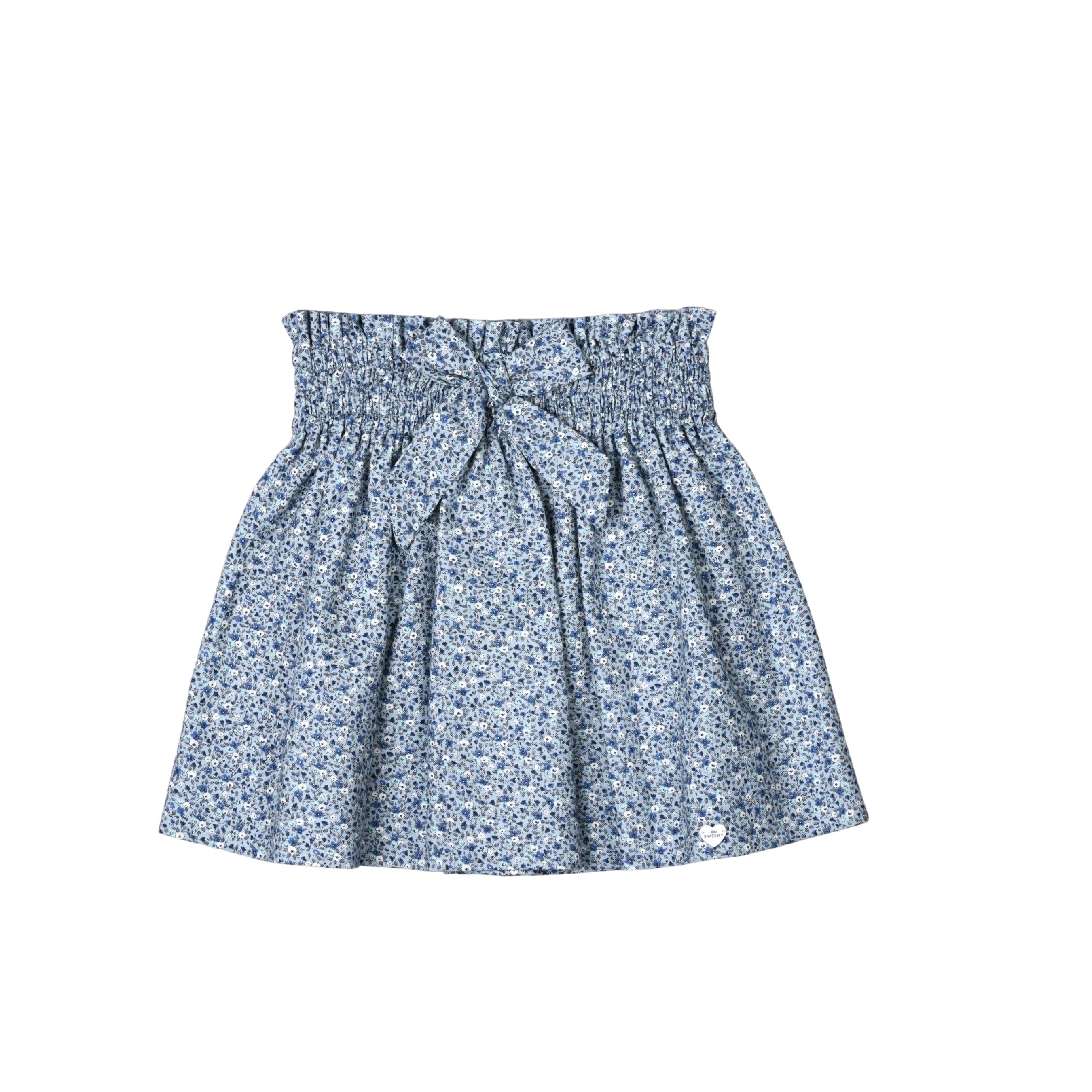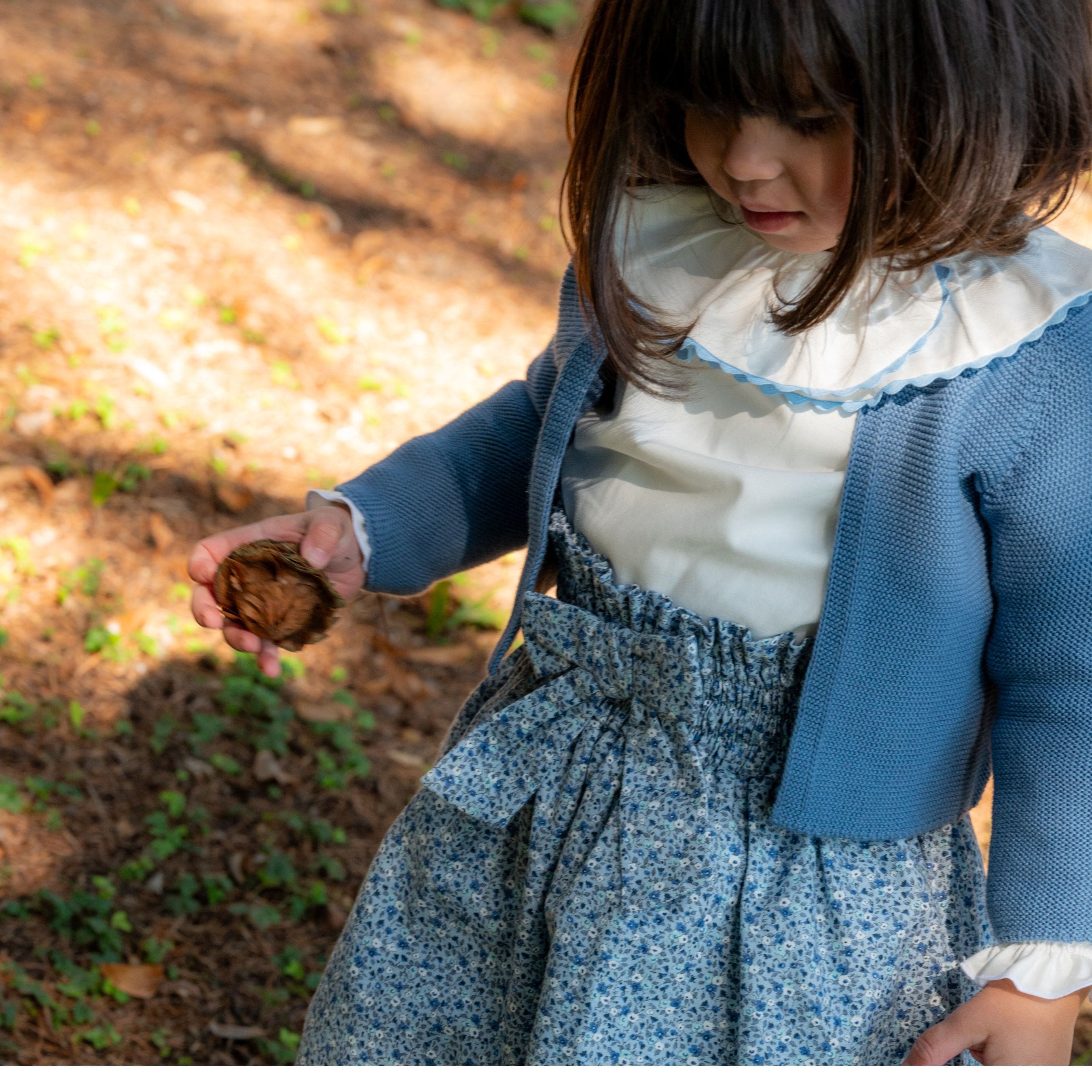 This charming cotton skirt for girls features a beautiful ivory, navy blue, and light blue floral pattern. Adorned with a decorative front bow, it also boasts a smocked waistband to ensure a comfortable fit. Pair it with our Colette blue cardigan and our white Eris blouse for an elegant look.