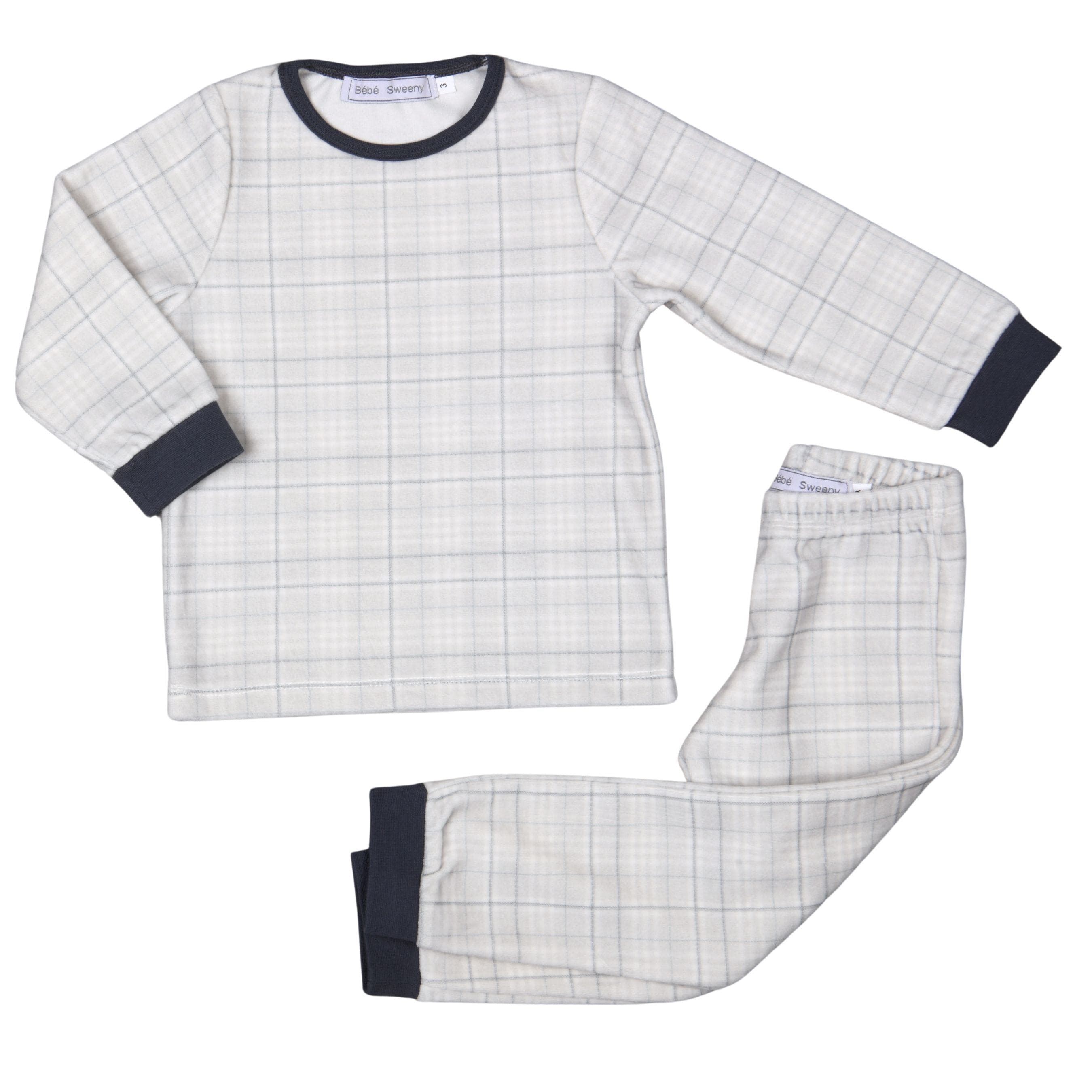 Patterned in a lovely blue and grey check, this set for boys is made from soft cotton velour. The long-sleeved top has stretchy navy blue trims on the cuffs and neckline, The matching bottoms feature a soft elastic waistband for added comfort.
