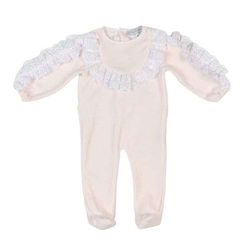 This all-in-one for girls comes in a delicate light pink color and is made from soft and stretchy velour. It features elegant frilly lace on the front and sleeves, and fastens with convenient poppers on the back and between the legs for easy dressing.