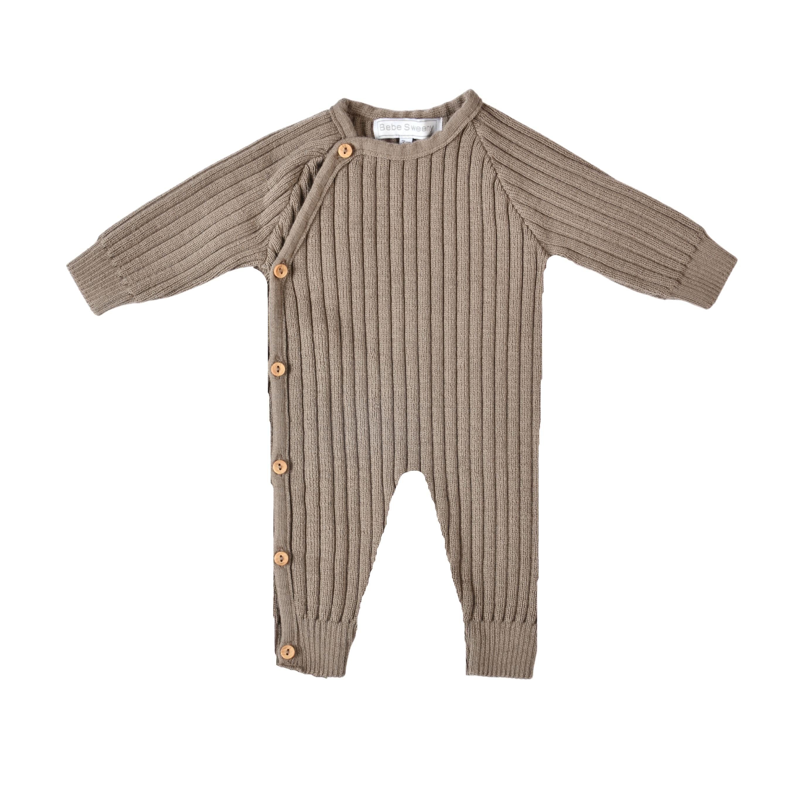 Joli body en tricot côtelé taupe pour garçons et filles, fabriqué dans un mélange de laine super doux. Fermeture facile par boutons en bois beige naturel sur le côté. Complétez cette tenue avec le chapeau, les bottines et la couverture assortis disponibles dans la même couleur.