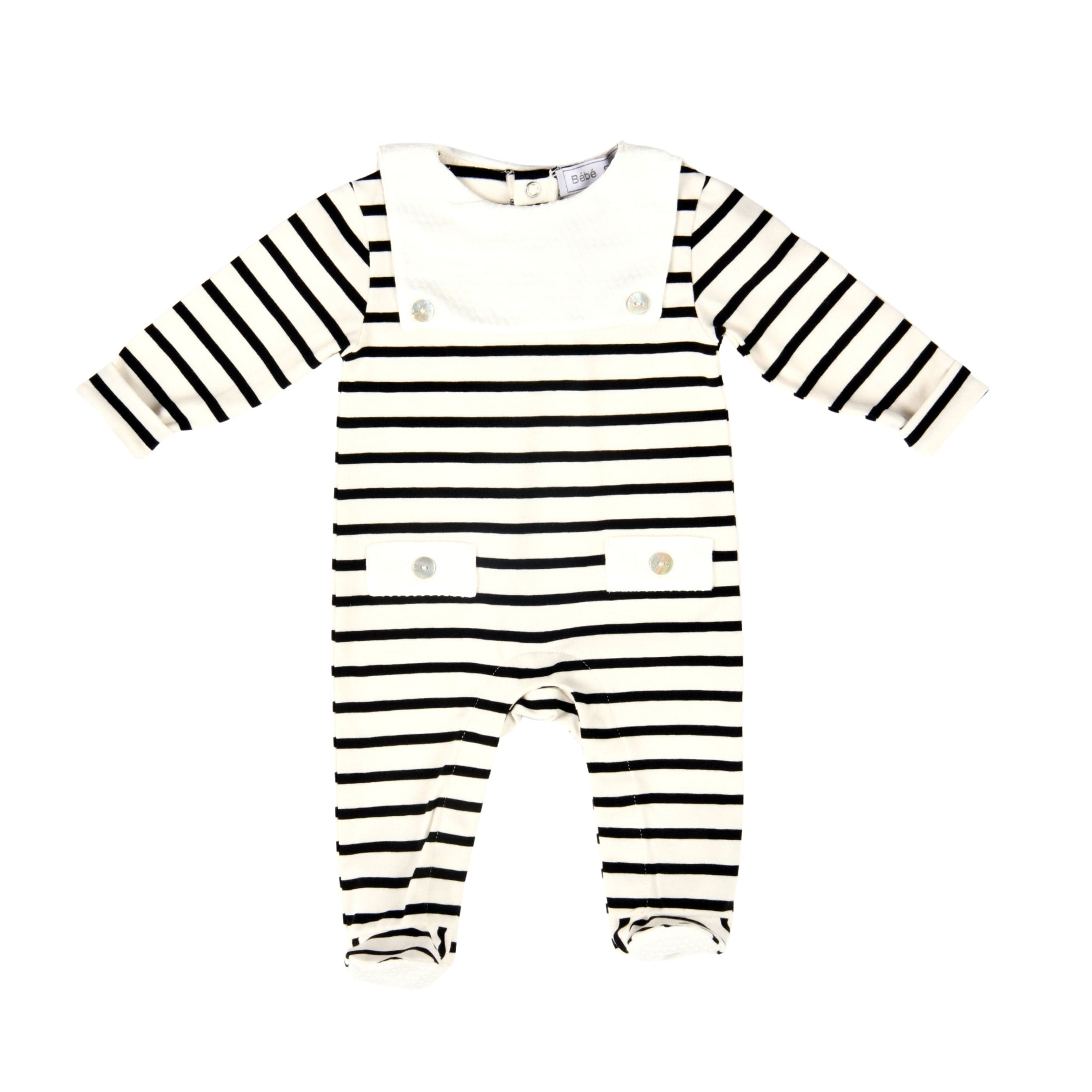Body pour bébé garçon à rayures ivoire et noires fabriqué en Interlock biologique d'épaisseur moyenne. Il possède un plastron ivoire et des poches en popeline de coton, avec galon assorti sous les pieds. Il y a des boutons-pression entre les jambes et dans le dos.