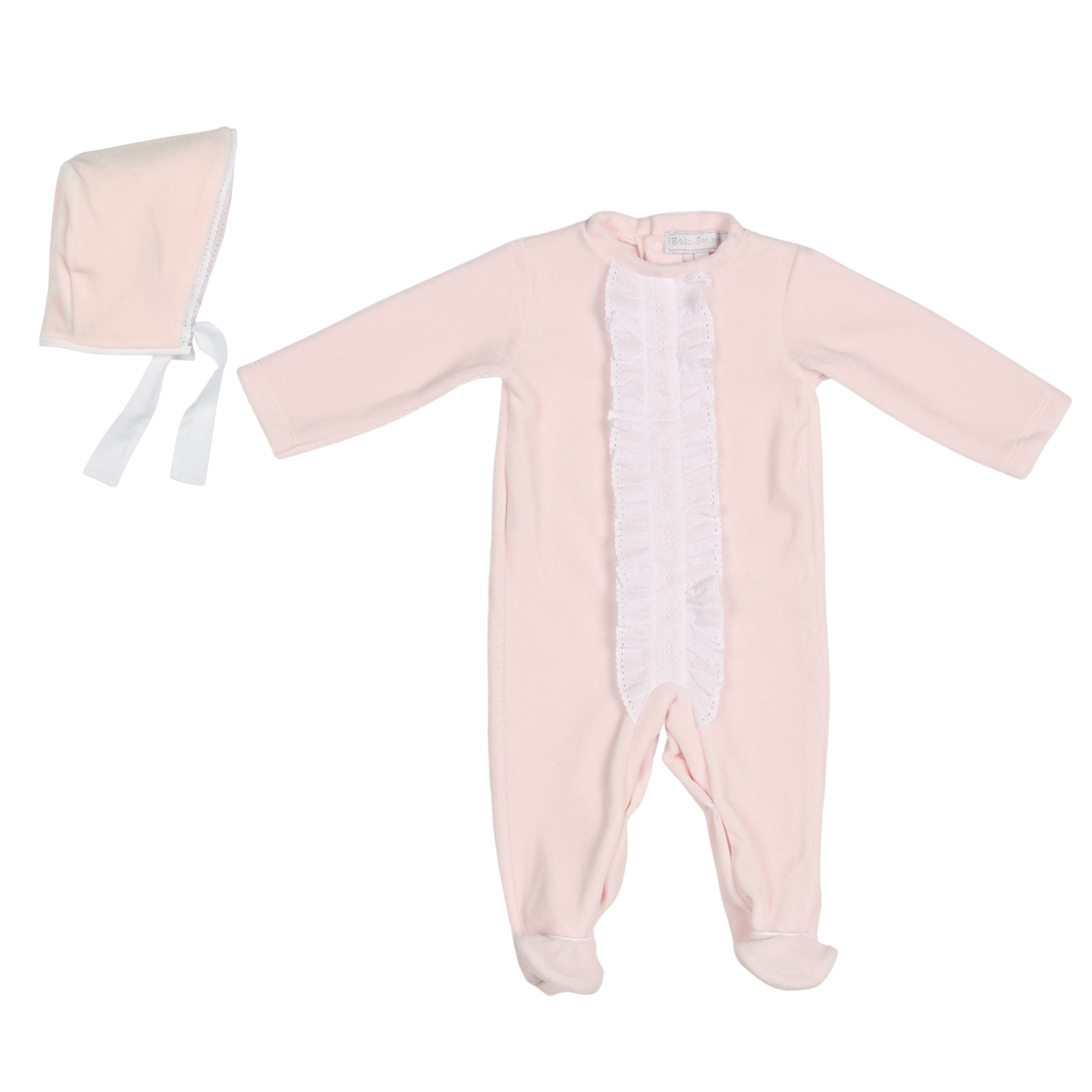 Ensemble babygrow en velours rose clair pour fille. Ce charmant ensemble deux pièces comprend une grenouillère et un bonnet. Super douce et extensible, la grenouillère est dotée d'un ruban de dentelle blanche sur le devant et de boutons-pression entre les jambes et dans le dos. Le chapeau layette a une jolie bordure en dentelle sur le devant avec des liens sous le menton et est doublé de jersey de coton léger, idéal pour le confort.