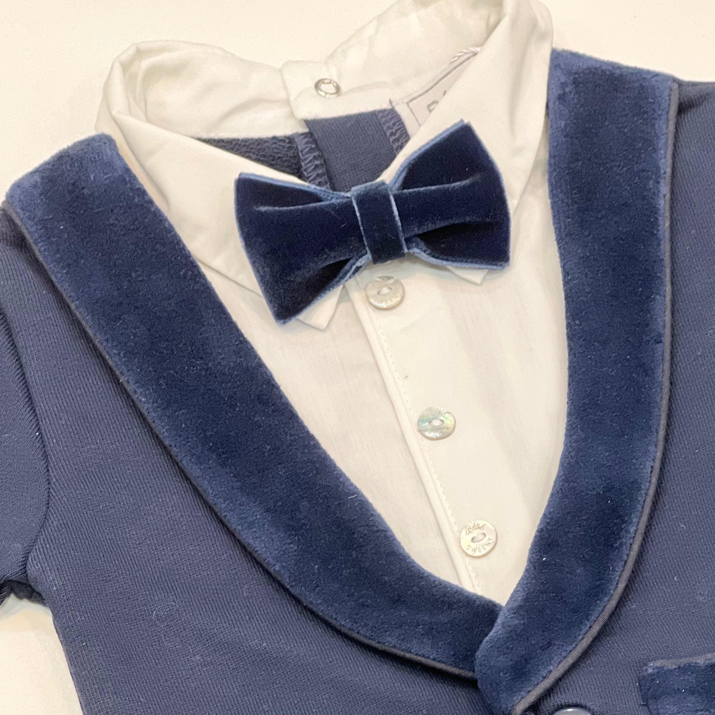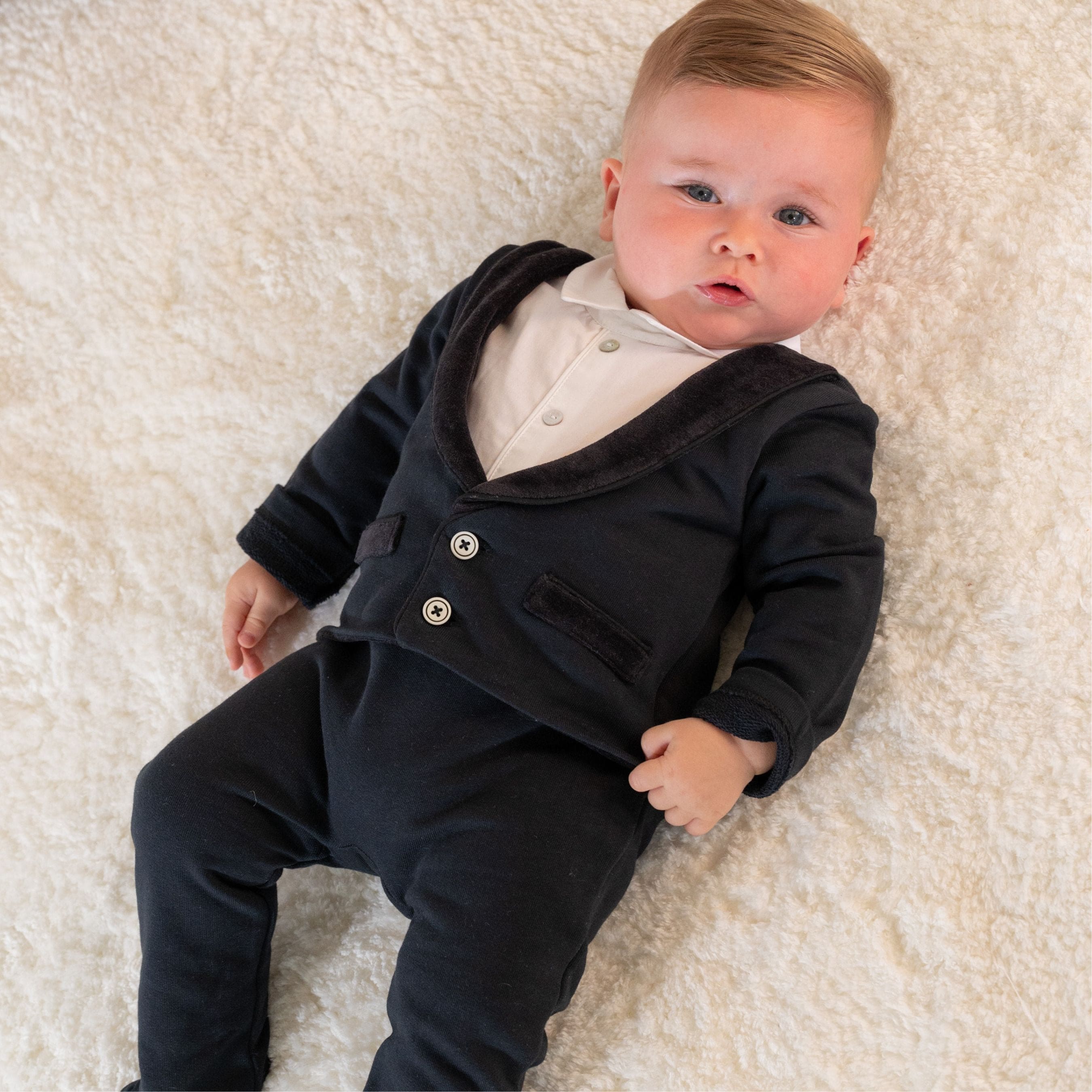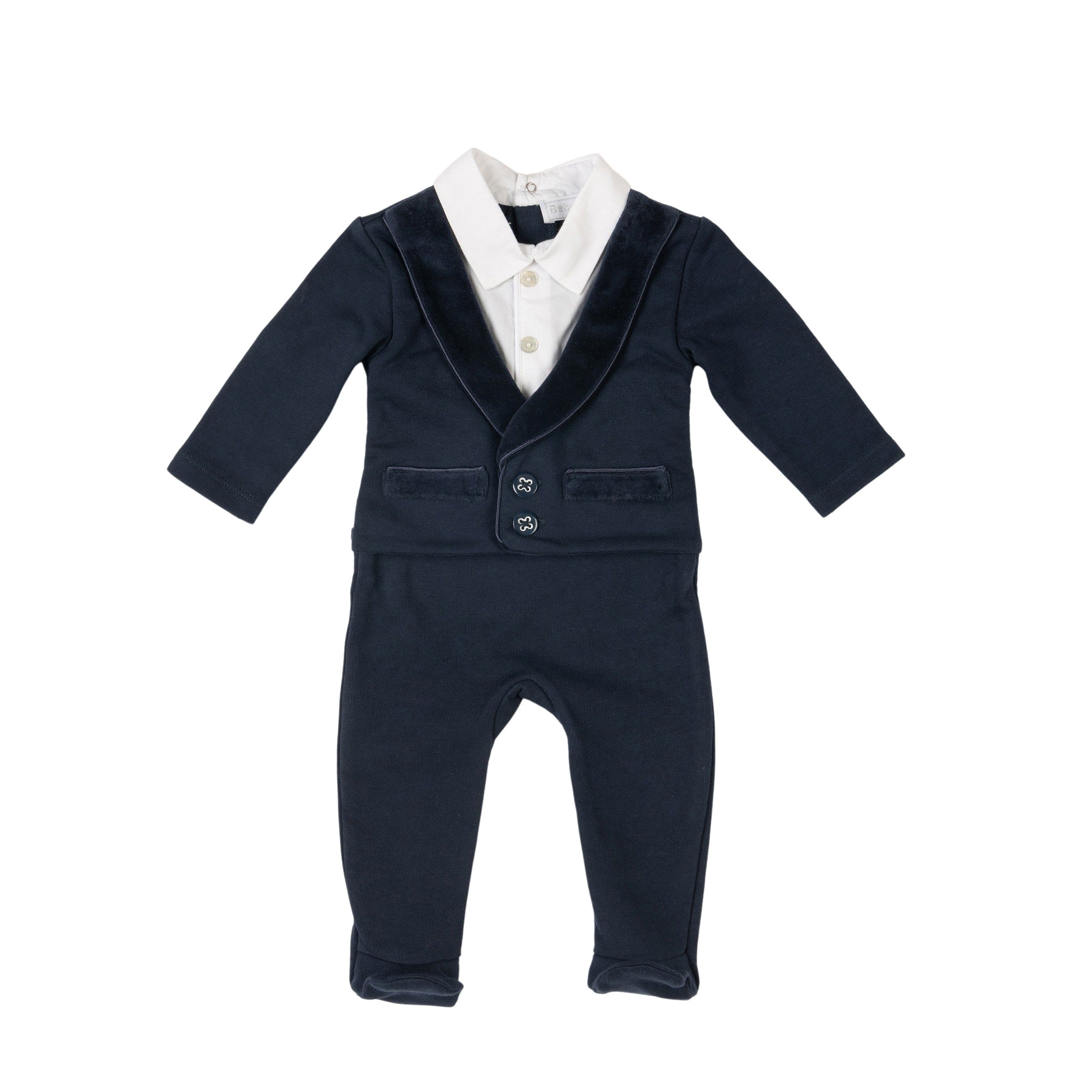 Un charmant baby-grow bleu marine pour garçon, confectionné en jersey de coton biologique ultra doux, idéal pour une occasion chic. Avec l'apparence d'un deux pièces, ce babysuit une pièce est doté d'un blazer superposé avec de fausses poches et de fermetures boutonnées et il se ferme avec des boutons-pression dans le dos.