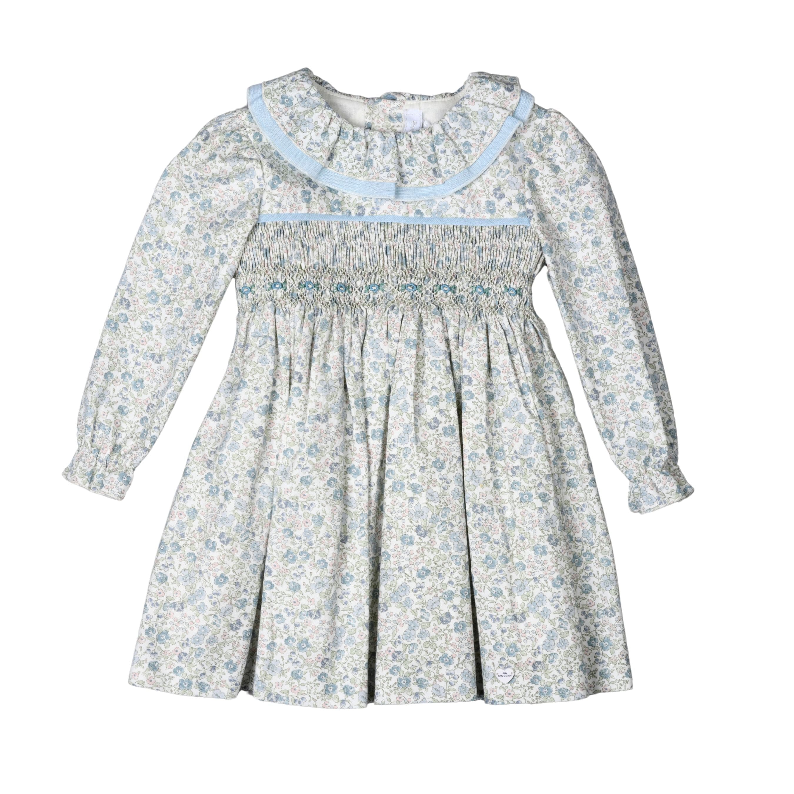 EGLANTINE | Girls Blue Hand-Smocked Floral Dress