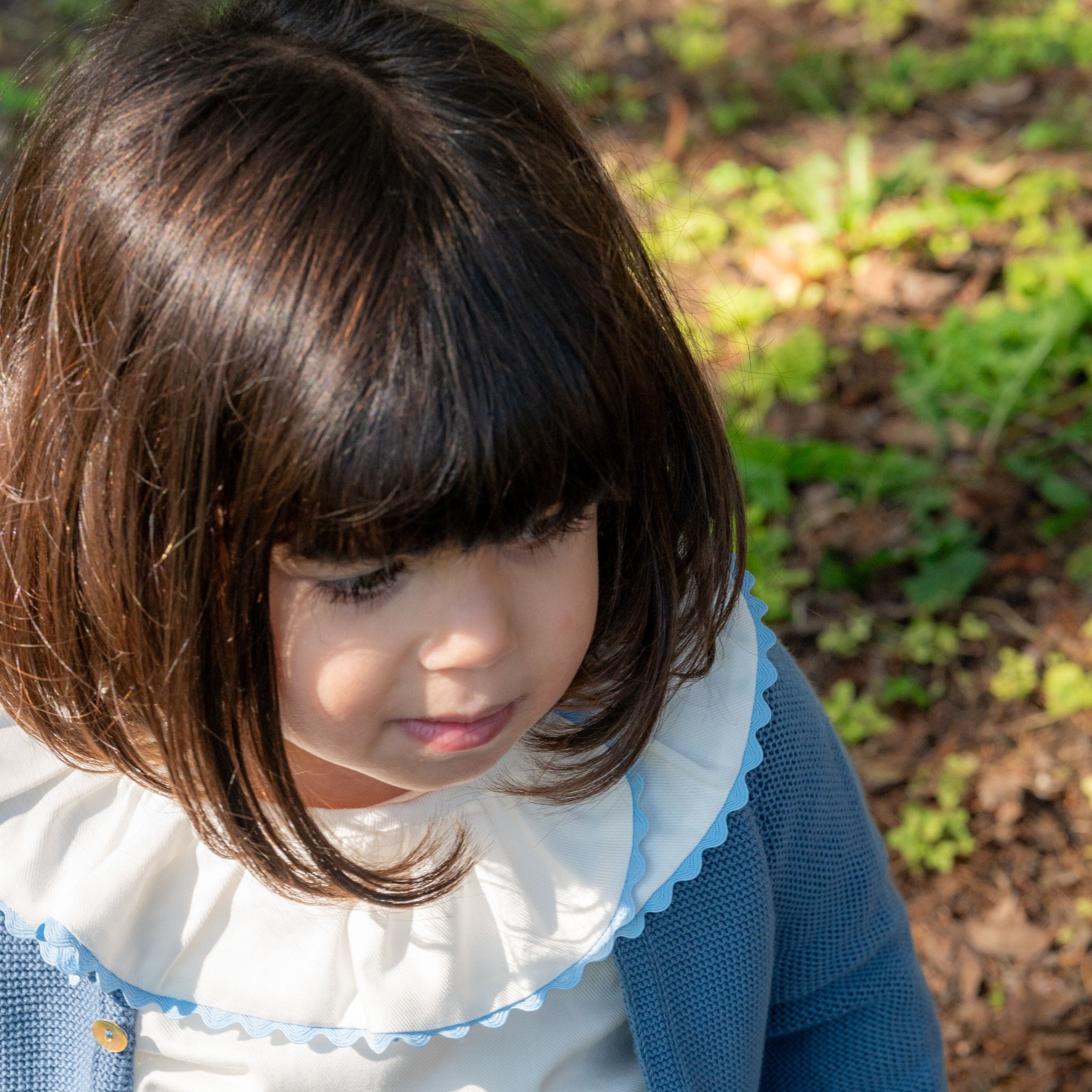 A beautiful girls' blouse made of soft poplin cotton, featuring a collared neckline, long puff sleeves, and decorative blue trim with serpentine ribbon details. This stylish piece also includes buttons on the back for added convenience. Complete the look with our Colette cardigan and Ermine skirt.