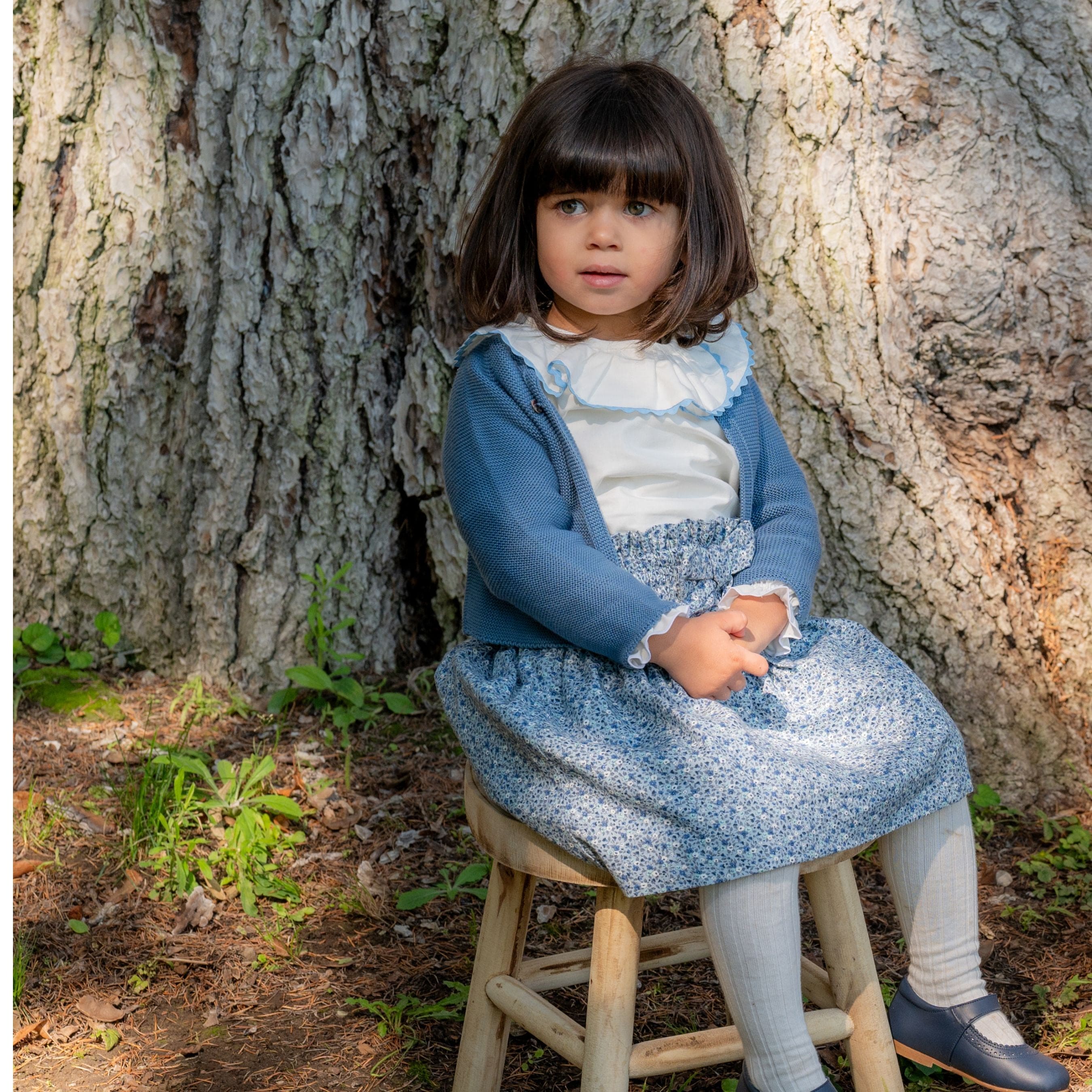 This charming cotton skirt for girls features a beautiful ivory, navy blue, and light blue floral pattern. Adorned with a decorative front bow, it also boasts a smocked waistband to ensure a comfortable fit. Pair it with our Colette blue cardigan and our white Eris blouse for an elegant look.