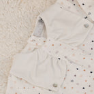 This ivory all-in-one features a delicate heart print and a soft, stretchy cotton-rich velour material, perfect for keeping baby cozy and comfortable. The adorable bow-shaped collar is made of ivory poplin and secured with a mother-of-pearl button logo on each side. Fastens easily with poppers on the back for convenient changing.