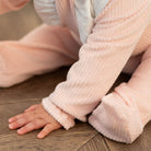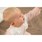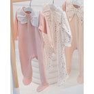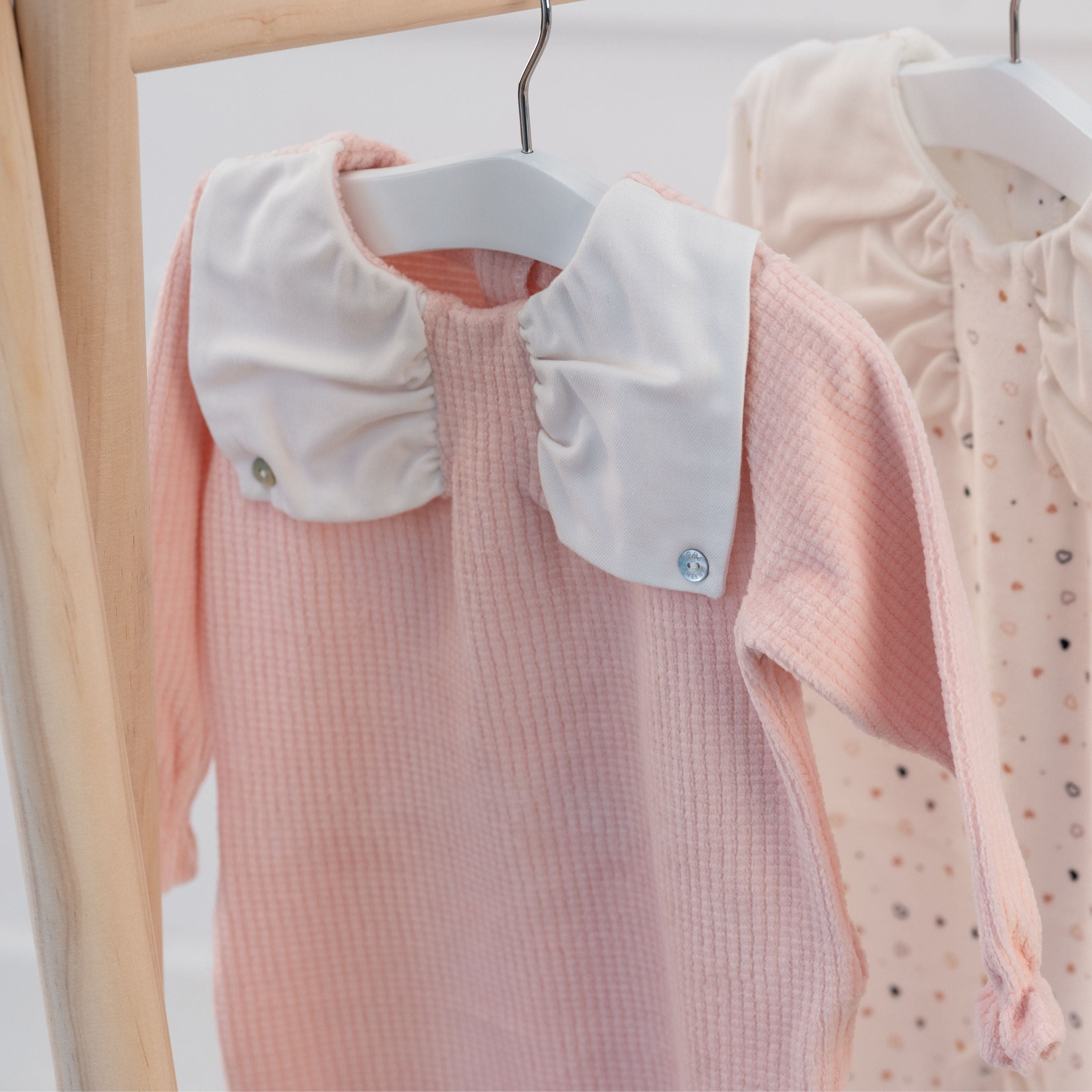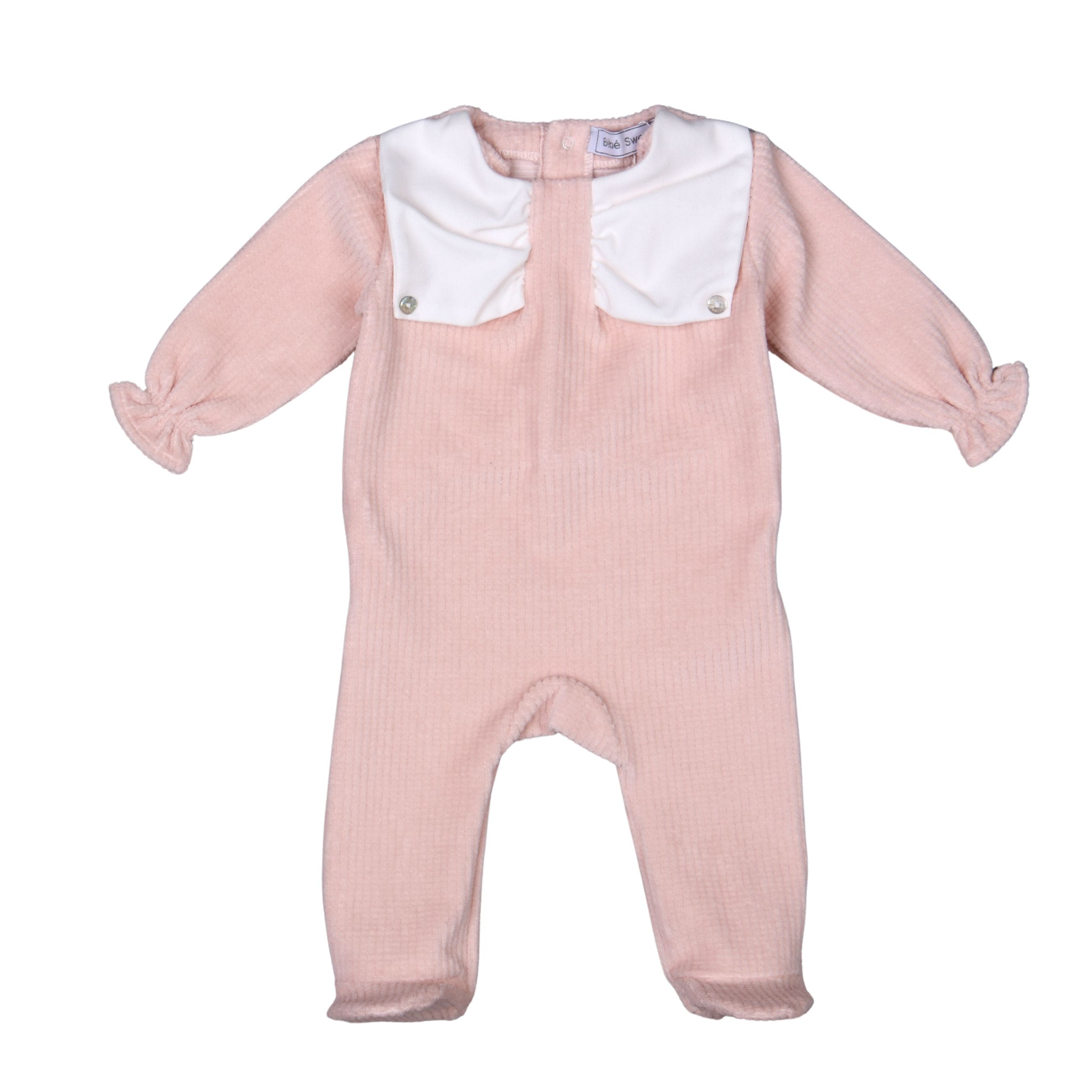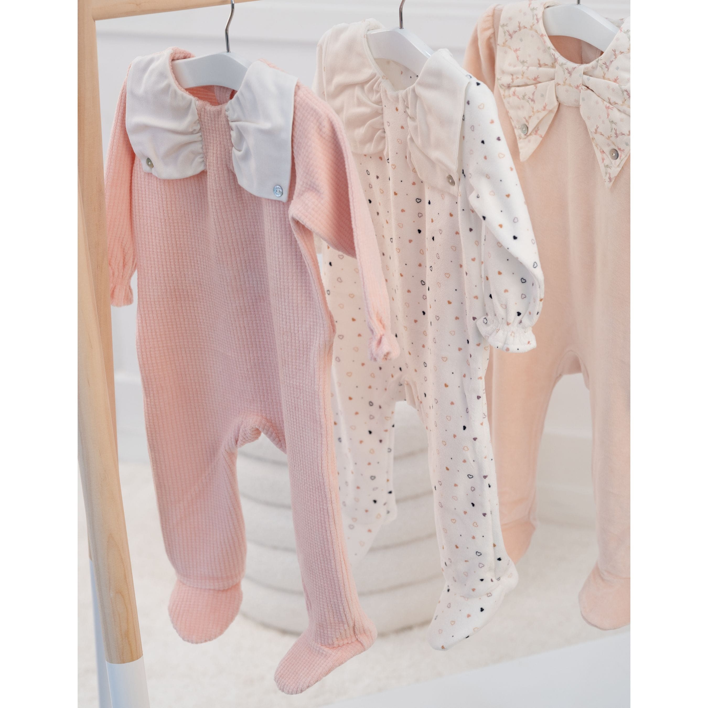 This elegant all-in-one is made from soft pink velour and features a unique embossed checkered texture. Perfect for keeping baby cozy and comfortable, the adorable bow-shaped collar is made of ivory poplin and secured with a mother-of-pearl button logo on each side. Fastens easily with poppers on the back for convenient changing.