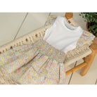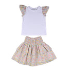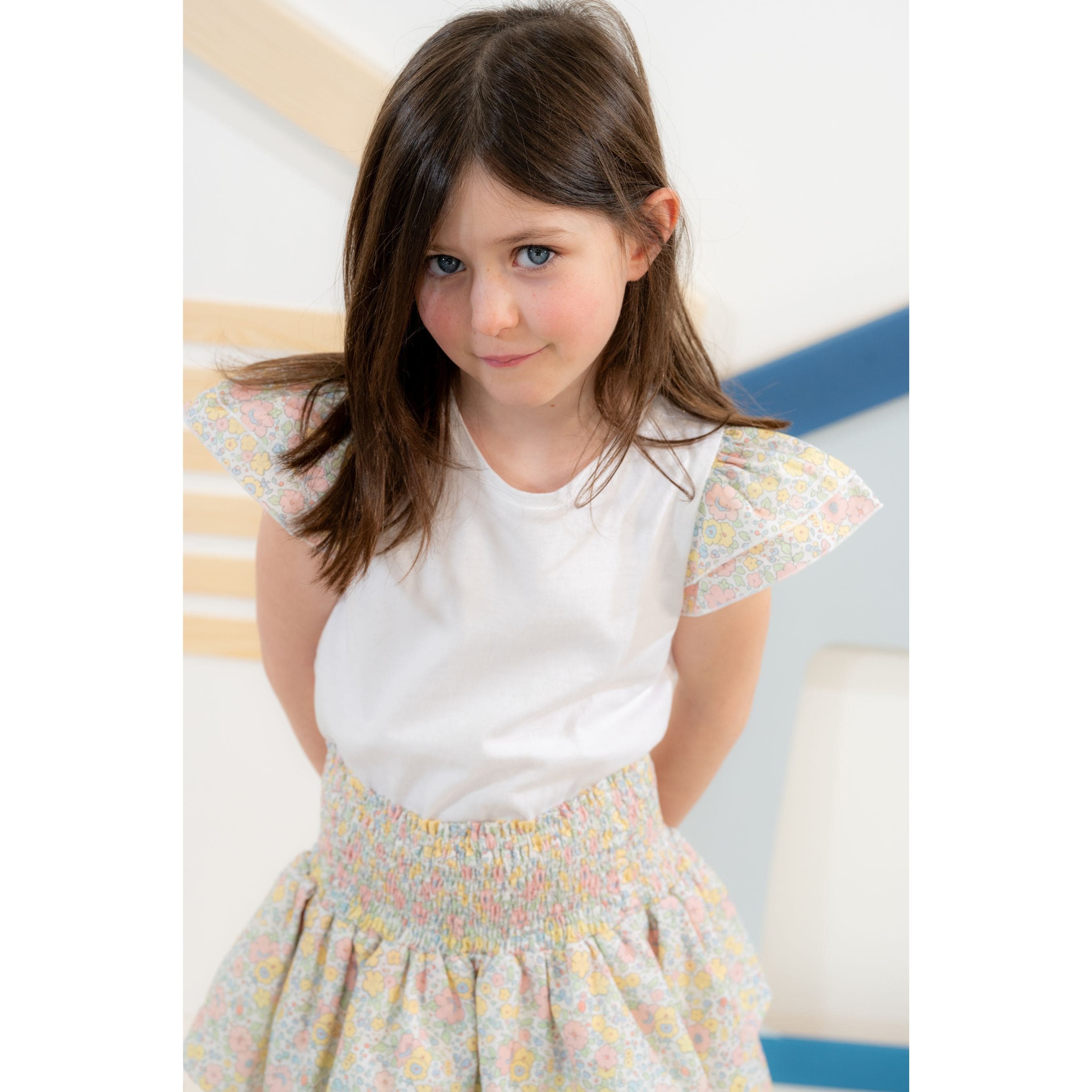 Pretty pink and yellow floral print cotton skirt set for girls, ideal for warmer weather. The white cotton jersey top has sweet ruffled sleeves and the tiered skirt has a summery floral print, with a comfortable, shirred waistband.