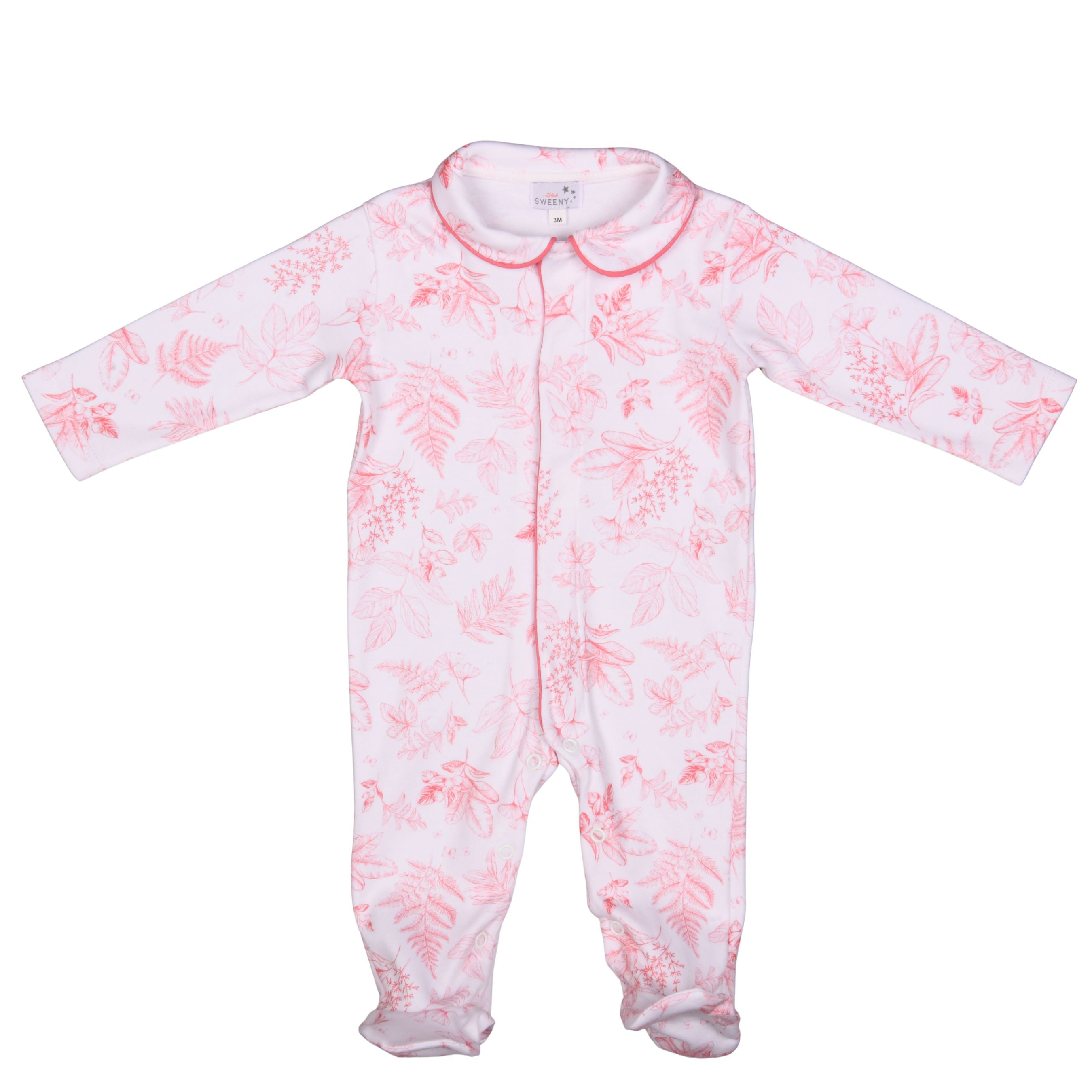 Elegant Toile de Jouy all-in-one crafted in soft interlock cotton, featuring Bebe Sweeny’s exclusive pink botanical print on a white base. The matching Peter Pan collar and delicate pink piping along the front opening create a timeless heritage silhouette, both refined and practical for baby’s early months.